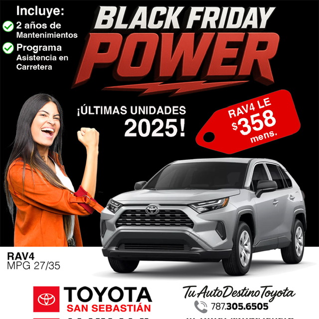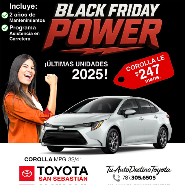 * Sujeto a aprobación de crédito. No incluye seguro, tablilla. Super ofertas gracias a los descuentos de nuestros auspiciadores. Ofertas no se combinan con otra oferta publicada ni se combinan entre si. Bonos no se cambian por dinero. Pagos calculados con FICO de 850 o más bajo los parámetros de las instituciones financieras. Pago de $247 mensuales en Corolla 1695 Stock S3030624 con precio de $24,500 a 84 meses al 4.95% APR con $7,000 de pronto. Pago de $289 mensuales en Corolla Cross 1680 Stock SV139707 con precio de $27,995 pagará $289 mensuales a 84 meses al 4.95% APR con $7,000 de pronto . Rav4 Código 4360 Stock SD136574 con precio de $32,336 pagará $358 mensuales a 84 meses al 4.95% APR con $7,000 de pronto. Tacoma modelo 7304 con precio de $45,995 menos $5,000 de bono = $40,995. Precios y ofertas no se combinan con otras publicadas. Válido hasta el 30 de noviembre de 2025. Corolla 1695 Stock S3030337 modelo 1695 desde $26,820 con bono aplicado de $2,825 = $23,995. Calculo pago mensual en Corolla 1695 2025 Stock S3030337 precio $25,259 pagará $241 mensuales con $7,000 de pronto a 84 meses al 2.99% APR. Corolla Cross 6380 stock SV130878 con precio de $27,995.00 pagará $277 mensuales con $7,000 de pronto a 84 meses al 2.99% APR. Toyota Tacoma 7328 Sport 4x4 Stock ST077549 desde $46,782.